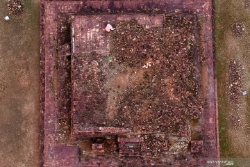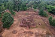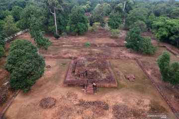 Petugas Balai Pelestarian Cagar Budaya Jambi membersihkan lumut yang tumbuh di dinding situs Candi Gedong I, Kawasan Percandian Muarajambi, Muarojambi, Jambi, Minggu (19/1/2020). Pembersihan dinding situs dilakukan rutin setiap hari untuk pemeliharaan. ANTARA FOTO/Wahdi Septiawan/foc.