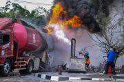 Petugas berusaha memadamkan api pada truk tangki pertamina yang terbakar ketika melakukan pengisian bahan bakar minyak (BBM) di SPBU 3446309 Batulawang, Desa Sukamukti, Kota Banjar, Jawa Barat, Senin (20/1/2020). ANTARA FOTO/Adeng Bustomi/nz