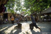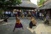 Warga bertarung dengan menggunakan rotan penjalin dan tameng yang terbuat dari kulit kerbau dalam tradisi Peresean di Kampung Adat Sasak Sade, Lombok Tengah, Nusa Tenggara Barat (NTB), Selasa (21/1/2020). Peresean yang merupakan seni tari masyarakat suku Sasak saat ini jadi daya tarik unggulan yang dapat menarik wisatawan baik lokal maupun asing untuk berkunjung ke Kampung Adat Sade. ANTARA FOTO/M N Kanwa/hp.