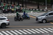 Dua pengendara sepeda motor berhenti di dalam Kotak Kuning Persimpangan (Yellow Box Junction) saat lampu merah menyala di Jalan MH Thamrin, Jakarta, Kamis (23/1/2020). Direktorat Lalu Lintas Polda Metro Jaya akan menerapkan tilang elektronik atau 'electronic traffic law enforcement' (ETLE) untuk pengendara sepeda motor di sepanjang Jalan Sudirman - MH Thamrin dan jalur koridor 6 Trans-Jakarta Ragunan-Dukuh Atas mulai awal Februari 2020. ANTARA FOTO/Aditya Pradana Putra/hp.