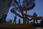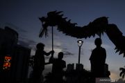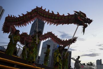 Grup barongsai Shen Lung Dragon and Lion Dance Indonesia menampilkan atraksi naga atau liong di kawasan Dukuh Atas, Jakarta, Kamis (23/1/2020). Pemprov DKI Jakarta menggandeng sejumlah komunitas dan masyarakat menyelenggarakan atraksi liong serta pertunjukan Gambang Kromong dan Tanjidor khas Betawi di kawasan DUkuh Atas dan Bundaran HI untuk perayaan tahun baru Imlek 2571. ANTARA FOTO/Wahyu Putro A/hp.