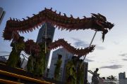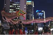 Kelompok Naga Merah Putih Bogor menampilkan atraksi naga atau liong di kawasan Dukuh Atas, Jakarta, Kamis (23/1/2020). Pemprov DKI Jakarta menggandeng sejumlah komunitas dan masyarakat menyelenggarakan atraksi liong serta pertunjukan Gambang Kromong dan Tanjidor khas Betawi di kawasan DUkuh Atas dan Bundaran HI untuk perayaan tahun baru Imlek 2571. ANTARA FOTO/Wahyu Putro A/hp.