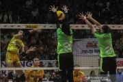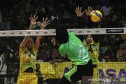 Pebola voli putri Jakarta PGN Popsivo Polwan Arsela (kedua kanan) dan Anastasia (kanan) mencoba menahan bola smes dari tim putri Gresik Petrokimia Puslatda Koni Jatim pada pertandingan putaran pertama Proliga 2020 di Gelanggang Remaja Pekanbaru, Riau, Minggu (26/1/2019). ANTARA FOTO/Rony Muharrman/pras.