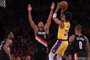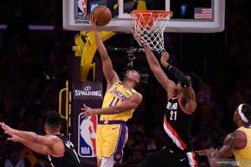 Pebasket Los Angeles Lakers Avery Bradley (kedua kiri) berupaya memasukkan bola ke dalam ring lawan dan dicegah pebasket Portland Trail Blazers Hassan Whiteside (kedua kanan) dalam laga lanjutan NBA, di Staples Center, Los Angeles, California, AS, Jumat (31/1/2020). Portland Trail Blazers berhasil mengalahkan kalahkan LA Lakers 127 - 119. ANTARA FOTO/Reuters- Robert Hanashiro-USA TODAY Sports/hp.