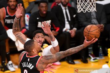 Pebasket Los Angeles Lakers Anthony Davis (kanan) berupaya menahan laju serangan pebasket Portland Trail Blazers Damian Lillard (kiri) dalam laga lanjutan NBA, di Staples Center, Los Angeles, California, AS, Jumat (31/1/2020). Portland Trail Blazers berhasil mengalahkan kalahkan LA Lakers 127 - 119. ANTARA FOTO/Reuters- Robert Hanashiro-USA TODAY Sports/hp.