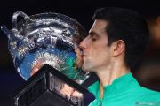 Petenis Serbia Novak Djokovic mencium trofi juara setelah menumbangkan petenis Austria Dominic Thiem pada partai final tunggal putra Australia Open di Melbourne Park, Melbourne, Australia, Minggu (2/2/2020). Djokovic menang dengan skor 6-4, 4-6, 2-6, 6-3, 6-4. ANTARAFOTO/REUTERS/Kai Pfaffenbach/foc.