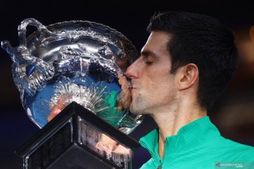 Petenis Serbia Novak Djokovic mengangkat trofi juara setelah menumbangkan petenis Austria Dominic Thiem pada partai final tunggal putra Australia Open di Melbourne Park, Melbourne, Australia, Minggu (2/2/2020). Djokovic menang dengan skor 6-4, 4-6, 2-6, 6-3, 6-4. ANTARAFOTO/REUTERS/Edgar Su/foc.