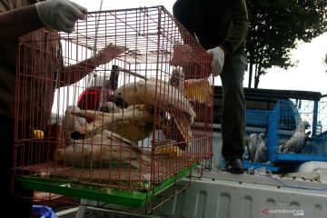 Sejumlah burung berada dalam kandang saat rilis kasus perdagangan satwa dilindungi di Polda Jawa Timur, Surabaya, Jawa Timur, Selasa (4/2/2020). Ditreskrimsus Polda Jawa Timur menangkap lima tersangka atas kasus memperdagangkan satwa dilindungi dan mengamankan 19 ekor Kakatua Maluku (Cacatua Moluccensis), sejumlah burung elang, satu ekor Rangkong Badak (Buceros Rhinoceros), dan 610 cangkang kerang berbagai jenis. ANTARA FOTO/Didik Suhartono/aww.