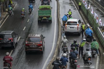 Petugas kepolisian merazia pengendara sepeda motor yang nekat melintasi jalur bus Transjakarta di Jalan Sultan Agung, Manggarai, Jakarta, Kamis (6/2/2020). ANTARA FOTO/Galih Pradipta/pras.