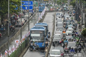 Sejumlah pengendara sepeda motor berusaha keluar dari jalur bus Transjakarta untuk menghindari razia polisi di Jalan Sultan Agung, Manggarai, Jakarta, Kamis (6/2/2020). Meski melanggar peraturan, sebagian pengguna jalan secara sengaja menggunakan jalur khusus Transjakarta tersebut. ANTARA FOTO/Galih Pradipta/pras.