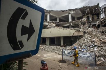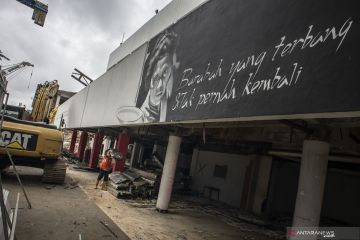 Pekerja beraktivitas di lokasi proyek revitalisasi kawasan Taman Ismail Marzuki (TIM) di Jakarta, Kamis (6/2/2020). Proses revitalisasi TIM yang ditargetkan selesai pada tahun 2021 itu sudah memasuki tahap II yakni membongkar gedung Graha Bhakti Budaya dan Galeri Cipta I. ANTARA FOTO/Aprillio Akbar/pras.