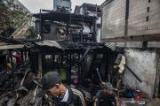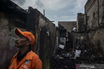 Warga beraktivitas di antara puing-puing bangunan pascakebakaran permukiman padat penduduk di Jalan Kebon Jeruk IV, Taman Sari, Jakarta, Jumat (7/2/2020). Kebakaran yang terjadi pada Kamis (6/2) malam itu menghanguskan kurang lebih 25 hunian semi permanen. ANTARA FOTO/Aprillio Akbar/aww.