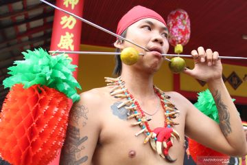 Seorang tatung (dukun Tionghoa yang kerasukan arwah leluhur) beratraksi di acara perayaan Cap Go Meh di Sungai Raya, Kabupaten Kubu Raya, Kalimantan Barat, Sabtu (8/2/2020). Atraksi tatung yang rutin dilakukan setiap perayaan Cap Go Meh tersebut menjadi salah satu agenda wisata di Kalimantan Barat. ANTARA FOTO/Jessica Helena Wuysang/wsj.