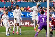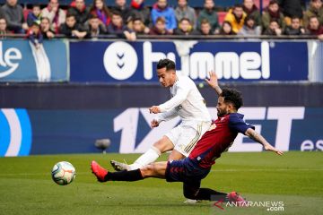 Pemain Real Madrid Sergio Ramos mencetak gol kedua ke gawang Osasuna pada pertandingan Liga Spanyol di stadion El Sadar, Pamplona, Minggu (9/2/2020). Madrid mengalahkan tuan rumah dengan skor 4-1. ANTARA FOTO/REUTERS/Vincent West/pras.