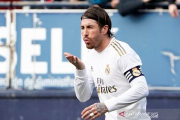Pemain Real Madrid Sergio Ramos merayakan gol kedua ke gawang Osasuna pada pertandingan Liga Spanyol di stadion El Sadar, Pamplona, Minggu (9/2/2020). Madrid mengalahkan tuan rumah dengan skor 4-1. ANTARA FOTO/REUTERS/Vincent West/pras.