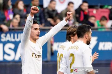 Pemain Real Madrid Lucas Vazquez mencetak gol ketiga ke gawang Osasuna pada pertandingan Liga Spanyol di stadion El Sadar, Pamplona, Minggu (9/2/2020). Madrid mengalahkan tuan rumah dengan skor 4-1. ANTARA FOTO/REUTERS/Vincent West/pras.