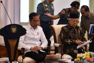 Presiden Joko Widodo (kiri) bersiap menyampaikan pengarahan disaksikan Wakil Presiden MaÕruf Amin dalam Sidang Kabinet Paripurna di Istana Bogor, Jawa Barat, Selasa (11/2/2020). Sidang kabinet tersebut membahas Antisipasi Dampak Perekonomian Global. ANTARA FOTO/Sigid Kurniawan/hp.