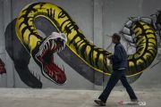 Warga berjalan di samping mural bertema satwa di bantaran Kali Opak, Penjaringan, Jakarta, Kamis (13/2/2020). Keberadaan mural tersebut menambah estetika dalam penataan kawasan bantaran yang saat ini berfungsi sebagai jalan inspeksi. ANTARA FOTO/Aprillio Akbar/aww.