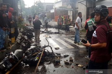 Petugas keamanan berusaha mengamankan situasi pascakerusuhan yang diduga akibat ulah supporter saat laga semi final Piala Gubernur Jawa Timur antara Persebaya melawan Arema di Blitar, Jawa Timur, Selasa (18/2/2020). Akibat kerusuhan tersebut, sejumlah kendaraan rusak berat dan beberapa orang luka-luka. ANTARA FOTO/Bimbim/ama.