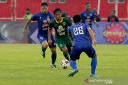Pemain Persebaya Nasir (tengah) menggiring bola melewati hadangan pemain Arema FC Taufik (kanan) pada laga semi final Piala Gubernur Jawa Timur yang digelar tanpa penonton di Stadion Gelora Soeprijadi, litar, Jawa Timur, Selasa (18/2/2020). Persebaya menang dengan skor 4-2 dan memastikan lolos ke partai final melawan Persija Jakarta. ANTARA FOTO/Irfan Anshori/pras.