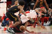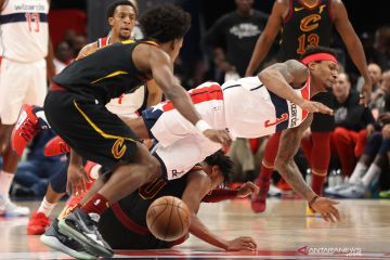 Pebasket Washington Wizards Bradley Beal (kedua kanan) dan pebasket Cleveland Cavaliers Darius Garland (kiri) berusaha mengambil bola muntah dalam laga lanjutan NBA, di Capital One Arena, Washington, Columbia, AS, Jumat (21/2/2020), Cleveland Cavaliers berhasil mengalahkan Washington Wizards 113 - 108. ANTARA FOTO/Reuters-Geoff Burke-USA TODAY Sports/hp.