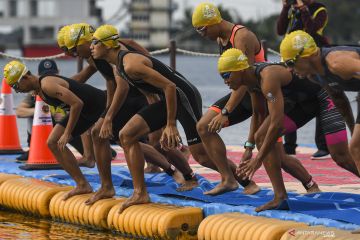 Sejumlah atlet Triathlon melakukan start saat tampil dikategori mens elite Palembang Triathlon 2020 di Jakabaring Sport City (JSC), Palembang, Sumatera Selatan, Sabtu (22/2/2020). Jauhari Johan menjadi yang tercepat kategori elite men dengan catatan waktu 2:05:00 disusul atlet dari Australia Blake Kappler 2:06:18 dan diposisi ketiga ditempati atlet Indonesia M Ahlulfirman 2:07:46. ANTARA FOTO/Nova Wahyudi/hp.