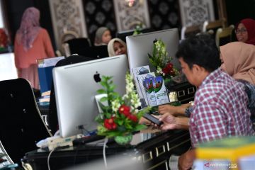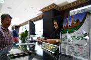 Calon jamaah umrah mencari informasi ibadah umrah di kantor pusat Maktour Travel Umrah dan Haji, Jakarta Timur, Kamis (27/2/2020). Kementerian Haji dan Umrah Arab Saudi menangguhkan sementara pelayanan umrah bagi warga dari luar kerajaan sebagai upaya mencegah penyebaran virus corona atau Covid-19. ANTARA FOTO/Sigid Kurniawan/hp.
