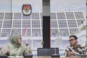Komisioner KPU Evi Novida Ginting Manik (kiri) dan Viryan Aziz berbincang saat konferensi pers terkait bakal pasangan calon perseorangan Pilkada serentak 2020 di gedung KPU, Jakarta, Kamis (27/2/2020). KPU mencatat sebanyak 147 bakal pasangan calon Bupati dan Wakil Bupati/Wali Kota dan Wakil Wali Kota yang maju lewat jalur perseorangan untuk Pilkada serentak 2020 diterima syarat jumlah dukungannya oleh KPU Kabupaten/Kota yang kemudian akan dilakukan tahap verifikasi administrasi. ANTARA FOTO/Hafidz Mubarak A/hp.