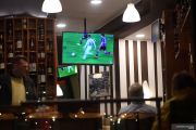 Suasana sejumlah masyarakat yang menonton pertandingan melalui layar televisi di sebuah kafe saat Inter Milan melawan Ludogorets dalam laga babak 32 besar Liga Europa, di Milan, Italia, Kamis (27/2/2020). Inter berhasil memenangkan pertandingan ini 2-1 dalam pertandingan yang digelar tanpa penonton menyusul wabah virus corona yang juga merebak di Italia. ANTARA FOTO/Reuters-Daniele Mascolo/hp.