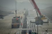 Pekerja memasang pembatas jalan pada proyek Jalan Tol Cileunyi-Sumedang-Dawuan (Cisumdawu) seksi I di Jatinangor, Kabupaten Sumedang, Jawa Barat, Jumat (28/2/2020). Komisi IV DPRD Provinsi Jawa Barat menargetkan pembangunan Jalan Tol Cisumdawu seksi 1 hingga 3 sepanjang 33 Km dapat digunakan untuk fungsional arus mudik dan balik pada Hari Raya Idul Fitri 2020 mendatang. ANTARA FOTO/Raisan Al Farisi/hp.