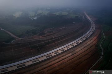 Foto udara proyek Jalan Tol Cileunyi-Sumedang-Dawuan (Cisumdawu) seksi I di Jatinangor, Kabupaten Sumedang, Jawa Barat, Jumat (28/2/2020). Komisi IV DPRD Provinsi Jawa Barat menargetkan pembangunan Jalan Tol Cisumdawu seksi 1 hingga 3 sepanjang 33 Km dapat digunakan untuk fungsional arus mudik dan balik pada Hari Raya Idul Fitri 2020 mendatang. ANTARA FOTO/Raisan Al Farisi/hp.