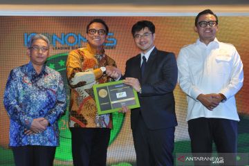 Direktur Jenderal Pengendalian Pencemaran dan Kerusakan Lingkungan (PPKL) Kementerian Lingkungan Hidup RM Karliansyah (tengah) menerima cinderamata dari Founder & CEO Iconomics Bram S Putro (kanan), didampingi Research Director Iconomics Alex Mulya, usai memberikan sambutan pada acara Indonesia CSR Brand Equity Award 2020, di Jakarta, Kamis (27/2/2020). Indonesia CSR Brand Equity Award 2020 yang diselenggarakan Iconomics memberikan apresiasi kepada 89 perusahaan dari berbagai sektor industri yang memiliki citra dan popularitas program CSR yang sejalan dengan Sustainable Development Goals (SDGs) yang dicanangkan Pemerintah dan Perserikatan Bangsa-bangsa (PBB). ANTARA FOTO/Audy Alwi/hp.