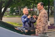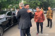 Menko Kemaritiman dan Investasi Luhut Binsar Panjaitan memeluk mantan Perdana Menteri Inggris Tonny Blair di halaman Istana Merdeka Jakarta, Jumat (28/2/2020). Tonny Blair datang bersama CEO Softbank Masayoshi Son untuk bertemu Presiden Joko Widodo dengan agenda utama membahas rencana pembangunan ibu kota baru Republik Indonesia. ANTARA/Hanni Sofia/aa.
