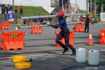 Peserta lomba ketangkasan beradu cepat pada HUT ke-101 Pemadam Kebakaran di Stadion Sultan Agung, Bantul, DI Yogyakarta, Sabtu (29/2/2020). Sebanyak 294 petugas kebakaran dari 49 Kabutapen/Kota se-Indonesia beradu kemampuan seperti lomba ketangkasan menggunakan alat dan teknik penyelamatan korban. ANTARA FOTO/Hendra Nurdiyansyah/ama.