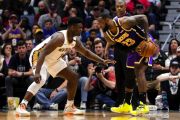 Pebasket New Orleans Pelicans Zion Williamson (tengah) dihadang oleh pebasket Los Angeles Lakers Kyle Kuzma (kiri) dan LeBron James (kanan) dalam pertandingan NBA, di Smoothie King Center, New Orleans, Louisiana, AS, Minggu (1/3/2020). Lakers berhasil mengalahkan tuan rumah New Orleans Pelicans 122 - 114. ANTARA FOTO/Reuters-Derick E. Hingle-USA TODAY Sports/hp