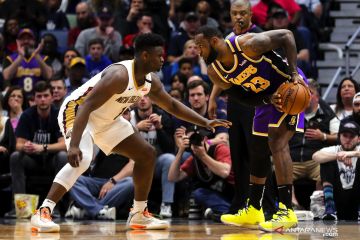pebasket New Orleans Pelicans Zion Williamson (kiri) menghadang laju serangan dari pebasket Los Angeles Lakers LeBron James (kanan) dalam pertandingan NBA, di Smoothie King Center, New Orleans, Louisiana, AS, Minggu (1/3/2020). Lakers berhasil mengalahkan tuan rumah New Orleans Pelicans 122 - 114. ANTARA FOTO/Reuters-Derick E. Hingle-USA TODAY Sports/hp
