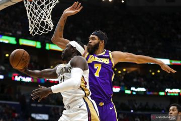 Pebasket New Orleans Pelicans Jrue Holiday (kiri) berupaya memasukkan bola ke dalam ring lawan yang dijaga pebasket Los Angeles Lakers JaVale McGee (kanan) dalam pertandingan NBA, di Smoothie King Center, New Orleans, Louisiana, AS, Minggu (1/3/2020). Lakers berhasil mengalahkan tuan rumah New Orleans Pelicans 122 - 114. ANTARA FOTO/Reuters-Derick E. Hingle-USA TODAY Sports/hp
