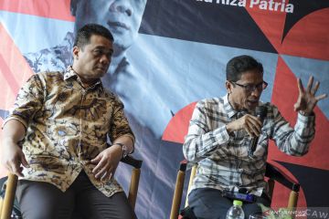 Calon Wakil Gubernur (Cawagub) DKI Jakarta dari Partai Gerindra, Ahmad Riza Patria (kiri) dan Cawagub DKI Jakarta dari PKS, Nurmansjah Lubis (kanan) menjadi pembicara dalam acara "Ngobrol Bareng Cawagub DKI" di Jakarta, Jumat (6/3/2020). Kegiatan tersebut diselenggarakan PSI Jakarta dengan tema "Solusi Banjir Ala Wakil Gubernur". ANTARA FOTO/Galih Pradipta/hp.