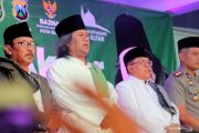 Plt Wali Kota Blitar Santoso (keempat kiri) bersama Kapolres Blitar Kota AKBP Leonard Sinambela (keempat kanan) serta sejumlah tokoh agama Islam dan pengasuh pondok pesantren bergandengan tangan saat Deklarasi Santri Dukung Pemilukada Damai 2020 di halaman Masjid Agung di Blitar, Jawa Timur, Selasa (10/3/2020) malam. Deklarasi sekaligus doa bersama yang diikuti sejumlah santri, pengasuh pondok pesantren dan tokoh agama Islam tersebut bertujuan untuk mendoakan agar pelaksanaan Pemilukada serentak yang akan dilaksanakan pada September 2020 mendatang berlangsung aman dan damai. ANTARA FOTO/Irfan Anshori/hp.