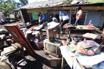 Sejumlah guru menyelamatkan barang yang terdampak banjir bandang di SDN 1 Sempol, Ijen, Bondowoso, Jawa Timur, Minggu (15/3/2020). Banjir bandang yang terjadi pada Sabtu (14/3/2020) itu, mengakibatkan sekolah tersebut rusak parah dan tidak dapat digunakan untuk proses belajar mengajar karena terendam material pasir hingga satu meter. ANTARA FOTO/Budi Candra Setya/aww.