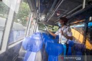 Petugas Dinas Perhubungan menyemprotkan cairan disifektan pada angkutan umum bus di kantor Dinas Perhubungan, Solo, Jawa Tengah, Selasa (17/3/2020). Penyemprotan tersebut sebagai langkah antisipasi penyebaran Virus Corona atau COVID-19 di transportasi umum. ANTARA FOTO/Mohammad Ayudha/pras.
