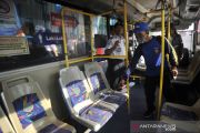 Anggota Tagana menyemprotkan disinfektan di dalam Bus Trans Padang, di Padang, Sumatera Barat, Selasa (17/3/2020). Pemkot Padang melalui taruna siaga bencana (tagana) Dinas Sosial bersama Dinas Perhubungan melakukan penyemprotan disinfektan di sarana transportasi umum seperti bus trans Padang dan angkutan kota (angkot) guna mencegah penyebaran COVID-19. ANTARA FOTO/Iggoy el Fitra/pras.