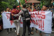 Seorang anggota kepolisian berusaha menghadang mahasiswa yang akan berunjuk rasa di halaman Pengadilan Negeri Bandung, Jawa Barat, Rabu (18/3/2020). Unjuk rasa yang dilakukan oleh Ikatan Mahasiswa Muhammadiyah tersebut menuntut agar Pengadilan Negeri Bandung membatalkan eksekusi aset berupa rumah panti asuhan milik Muhammadiyah di Bandung. ANTARA FOTO/Raisan Al Farisi/hp.