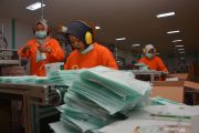 Buruh menyelesaikan pembuatan masker di PT Jayamas Medica Desa Karangwinongan, Kecamatan Mojoagung, Kabupaten Jombang, Jawa Timur, Rabu (18/3/2020). Karena kekurangan bahan baku, dalam sehari pabrik tersebut hanya memproduksi masker sebanyak 300 ribu lembar dari biasanya sebelum wabah virus COVID-19 bisa mencapai 1 juta lembar masker. ANTARA FOTO/Syaiful Arif/hp.