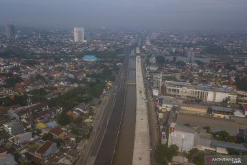 Foto udara lalu lintas dari Bekasi menuju Jakarta yang terpantau lancar di jalan KH Noer Ali, Kalimalang, Bekasi, Jawa Barat, Senin (23/3/2020). Lalu lintas yang lengang itu sebagai dampak imbauan pemerintah kepada perusahaan terkait kebijakan bekerja di rumah bagi karyawannya untuk mengurangi penyebaran COVID-19. ANTARA FOTO/ Fakhri Hermansyah/hp.