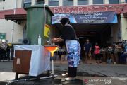 Warga memanfaatkan fasilitas cuci tangan hasil modifikasi bak sampah menjadi tandon air di kawasan Pasar Gede Solo, Jawa Tengah, Selasa (24/3/2020). Pemerintah Kota (Pemkot) Solo memasang fasilitas tempat cuci tangan tersebut sebagai bagian dari upaya memutus rantai penyebaran virus corona (Covid-19) di pusat keramaian. ANTARA FOTO/Maulana Surya/pras.