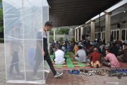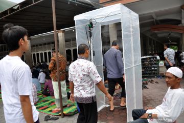 Sejumlah jamaah memasuki bilik semprot disinfektan sebelum mengikuti shalat Jumat berjamaah di Masjid Al Jihad Medan, Sumatera Utara, Jumat (27/3/2020). Guna mengantisipasi penularan virus COVID-19 pihak masjid di tempat itu tetap melaksanakan shalat Jumat berjamaah dengan melakukan semprot disinfektan bagi jamaah terlebih dahulu. ANTARA FOTO/Septianda Perdana/hp.