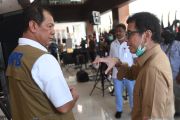 Menparekraf Wishnutama Kusubandio (kanan) berbincang dengan Ketua Gugus Tugas Percepatan Penanganan COVID-19 Doni Monardo (kiri) sebelum memberikan keterangan terkait penanganan kasus COVID-19 di Jakarta, Sabtu (28/3/2020). Pemerintah akan memberikan fasilitas hotel dan transportasi gratis bagi 1100 tenaga medis penanganan virus corona. ANTARA FOTO/Akbar Nugroho Gumay/hp.