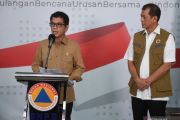Menparekraf Wishnutama Kusubandio (kiri) memberikan keterangan disaksikan Ketua Gugus Tugas Percepatan Penanganan COVID-19 Doni Monardo (kanan) dalam konferensi pers di Jakarta, Sabtu (28/3/2020). Pemerintah akan memberikan fasilitas hotel dan transportasi gratis bagi 1100 tenaga medis penanganan virus corona. ANTARA FOTO/Akbar Nugroho Gumay/hp.