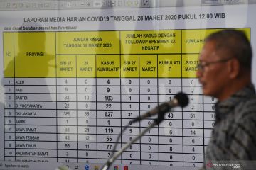 Juru bicara pemerintah untuk penanganan COVID-19 Achmad Yurianto memberikan keterangan terkait perkembangan kasus COVID-19 dalam konferensi pers di Jakarta, Sabtu (28/3/2020). Achmad Yurianto menyatakan, hingga pukul 12.00, jumlah pasien positif COVID-19 di Indonesia telah mencapai 1.155 kasus, sementara kasus kematian mencapai 102 orang dan pasien yang telah dinyatakan sembuh sebanyak 59 orang. ANTARA FOTO/Akbar Nugroho Gumay/hp.